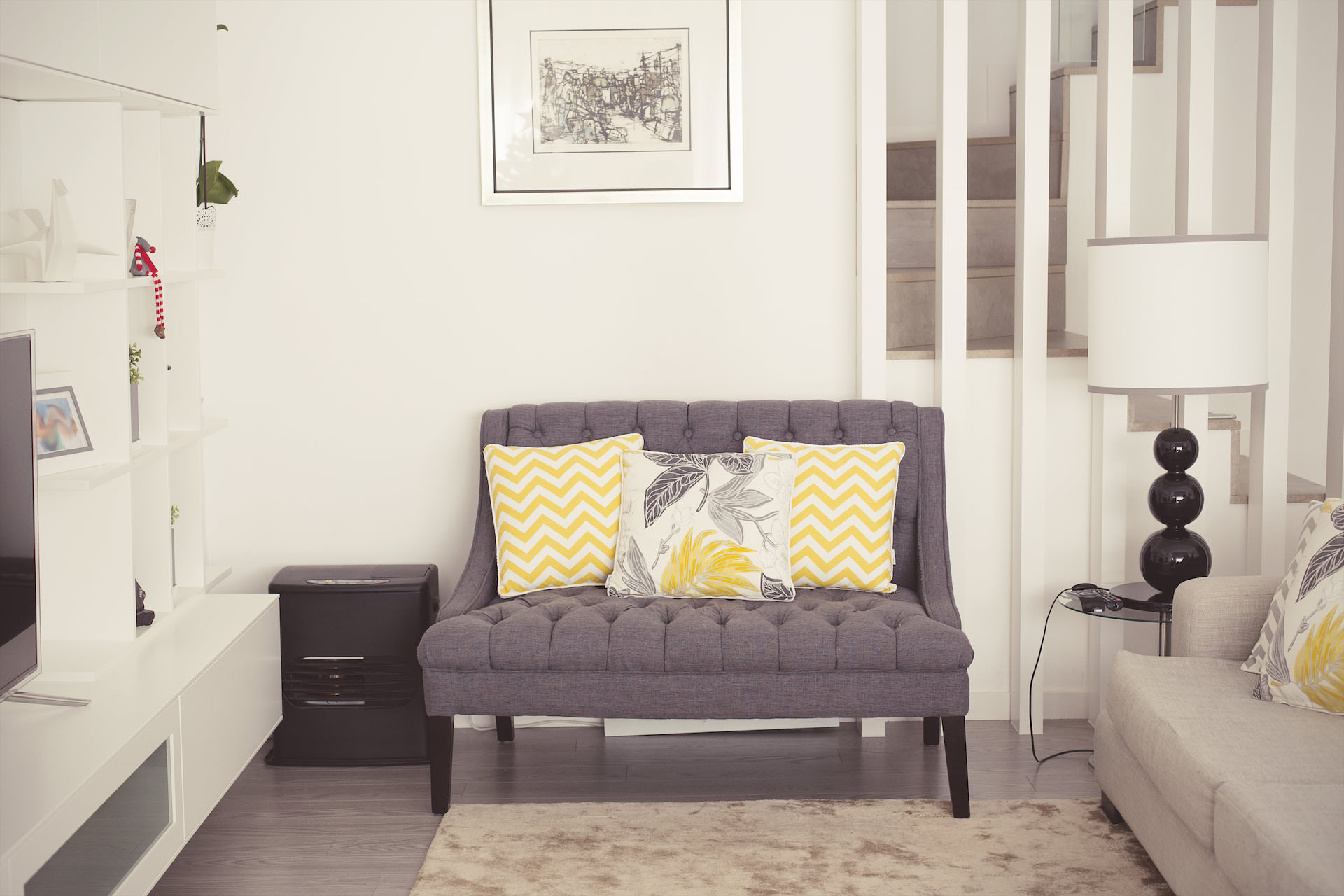 A conjugação de padrões geométricos e florais nas almofadas e o movimento da base do candeeiro, tornaram esta sala de base neutra, num espaço alegre e contemporâneo.